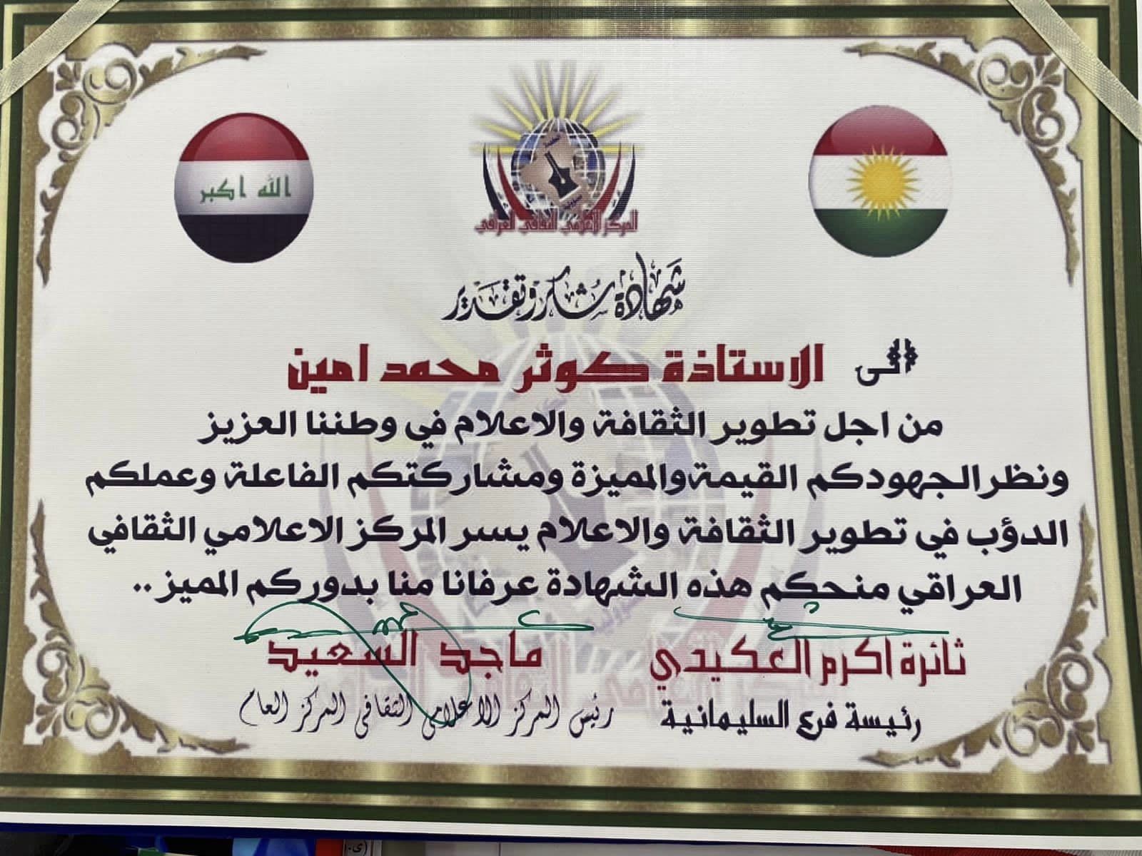 لەپای هەوڵەکانی بۆ بەرەوپێشبردنی رۆشنبیری و راگەیاندن لە وڵات دا و هەوڵە پربایەخ و بەشدارییەکانی، ناوەندی راگەیاندن و رۆشنبیری عێراقی بڕوانامەی سوپاس و پێزانینی بەخشییە خاتوو کەوسەر محەمەد ئەمین بەڕێوەبەری کتێبخانەی ئەوقافی سلێمانی. ئەو بڕوانامەیەش لەلایەن وەفدێکی ناوەندی راگەیاندن و رۆشنبیری عێراقی لقی سلێمانی بەسەرۆکایەتی ماجد سەعید بەرێوەبەری گشتی ناوەندەکە و موئەیەد شێخلی بەرێوەبەری راگەیاندنی ناوەندەکە و خەمیس حەیانی راوێژکاری رۆشنبیری و سائیرە ئەکرەم بەرێوەبەری گشتی ناوەندەکە لە سلێمانی و ئاشی سەلاحەدین بەرێوەبەری کارگێڕی لقی سلێمانی و مامۆستا مەهدی رێکخەری گشتیەوە بەخشرا بە خاتوو کەوسەر.
